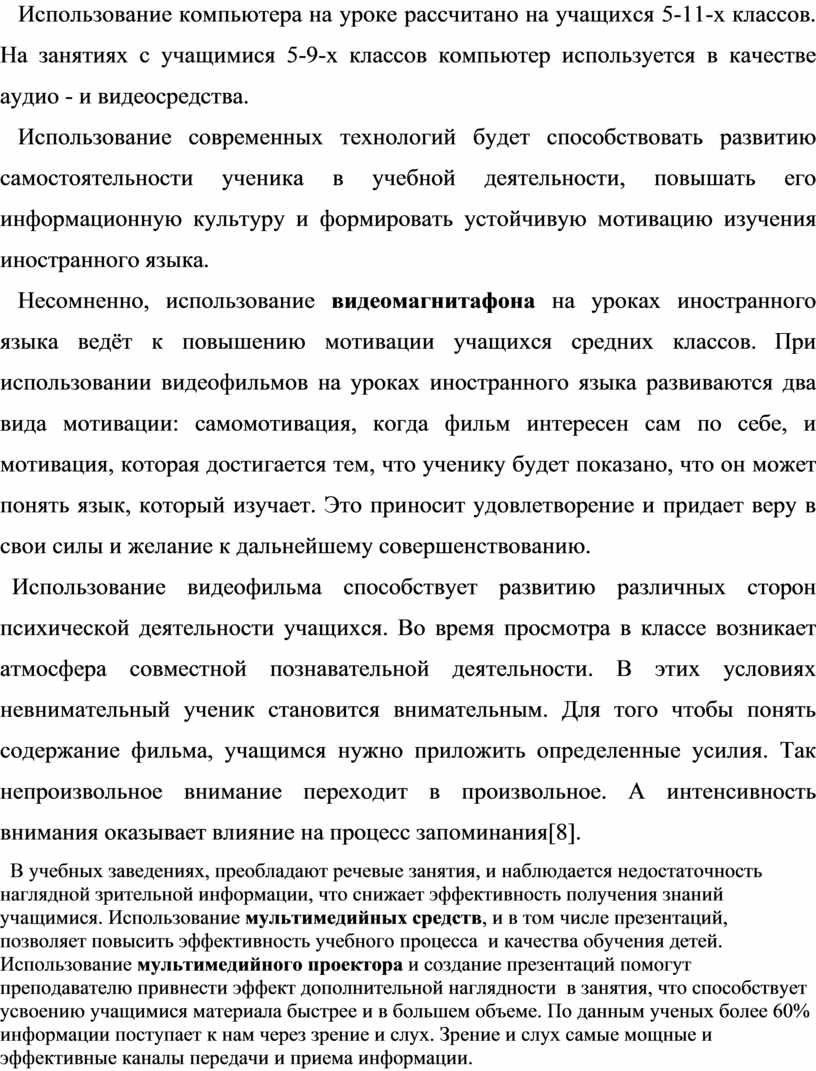 Использование проекционной техники в сочетании с аудиосредствами дает возможность привлекать на занятиях при объяснении нового материала тезисы, таблицы, видео - и справочные материалы, при анализе текстов - схемы и данные электронных словарей. Это позволяет реализовать принципы наглядности, доступности и системности изложения материала.