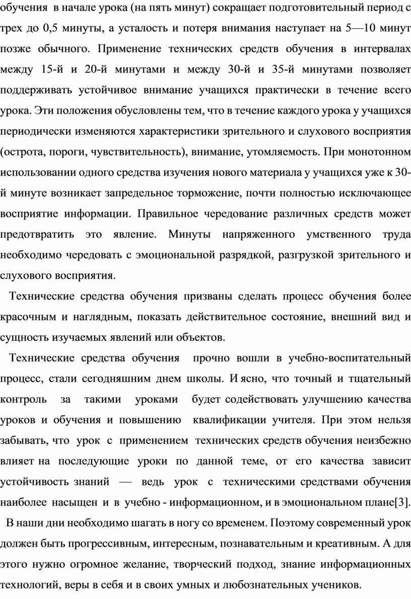 Эффективность применения технических средств обучения зависит также от этапа урока. Использование технических средств обучения не должно длиться на уроке подряд более 20 минут: учащиеся устают, перестают понимать, не могут осмыслить новую информацию. Использование технических средств обучения в начале урока (на пять минут) сокращает подготовительный период с трех до 0,5 минуты, а усталость и потеря внимания наступает на 5—10 минут позже обычного. Применение технических средств обучения в интервалах между 15-й и 20-й минутами и между 30-й и 35-й минутами позволяет поддерживать устойчивое внимание учащихся практически в течение всего урока. Эти положения обусловлены тем, что в течение каждого урока у учащихся периодически изменяются характеристики зрительного и слухового восприятия (острота, пороги, чувствительность), внимание, утомляемость. При монотонном использовании одного средства изучения нового материала у учащихся уже к 30-й минуте возникает запредельное торможение, почти полностью исключающее восприятие информации. Правильное чередование различных средств может предотвратить это явление. Минуты напряженного умственного труда необходимо чередовать с эмоциональной разрядкой, разгрузкой зрительного и слухового восприятия.