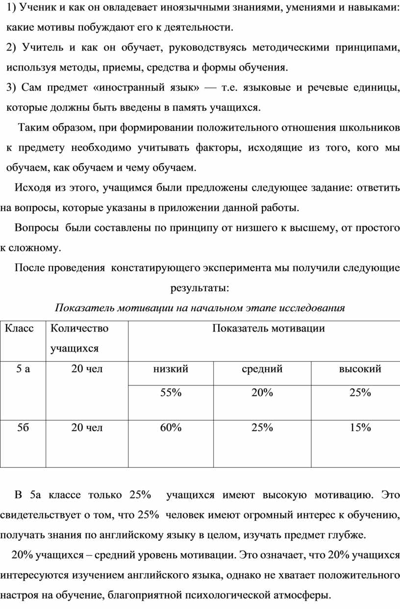 На констатирующем этапе мы выявили исходный уровень мотивации у учащихся средних классов: 5а, 5б.
