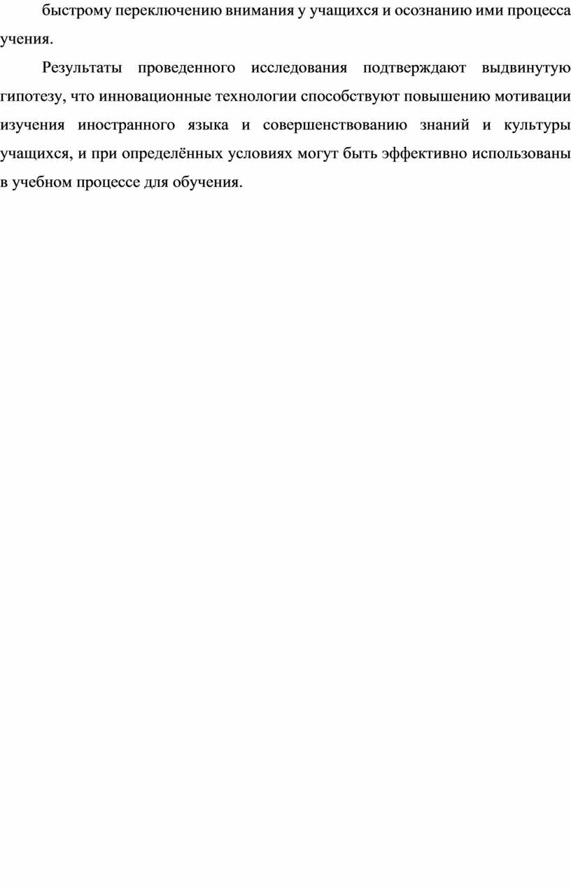 Результаты проведенного исследования подтверждают выдвинутую гипотезу, что инновационные технологии способствуют повышению мотивации изучения иностранного языка и совершенствованию знаний и культуры учащихся, и при определённых условиях могут быть эффективно использованы в учебном процессе для обучения.
