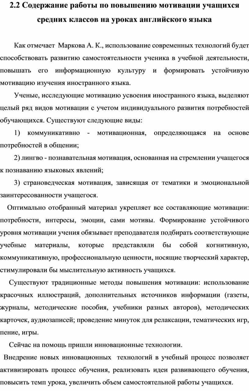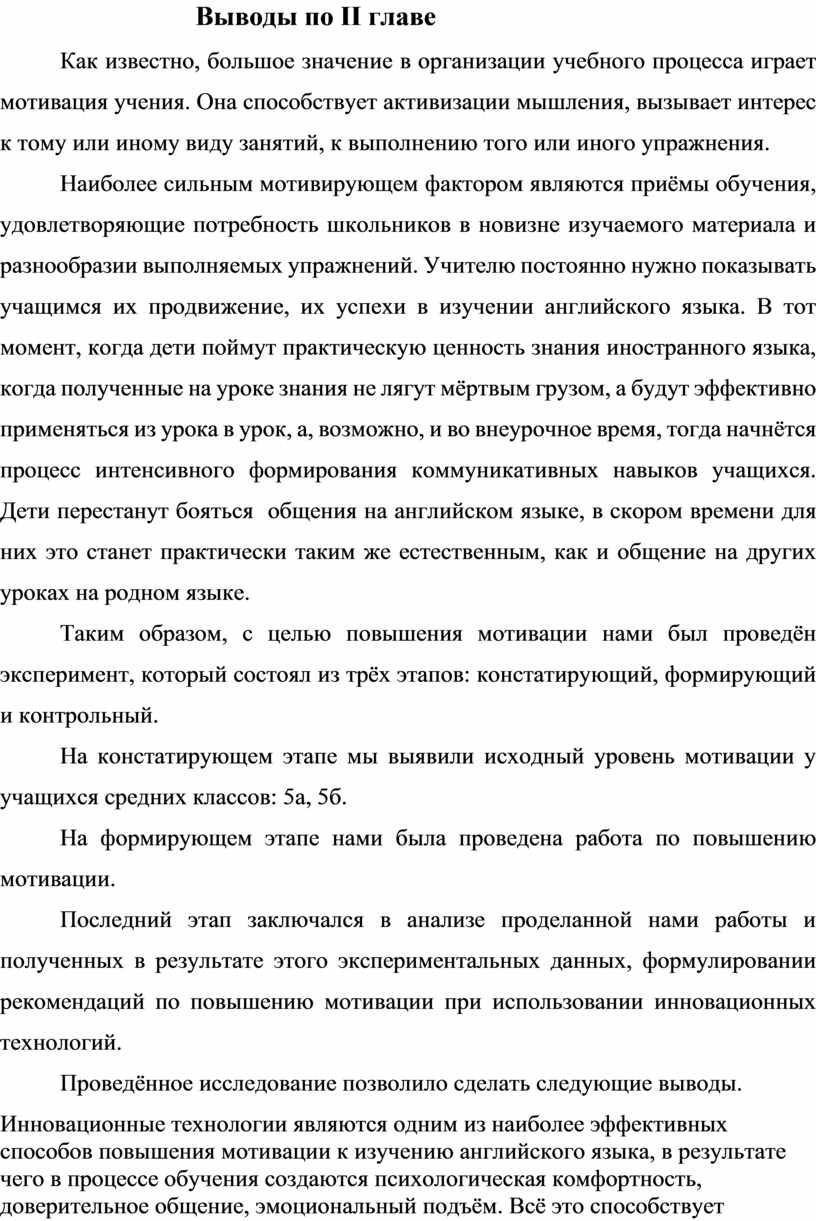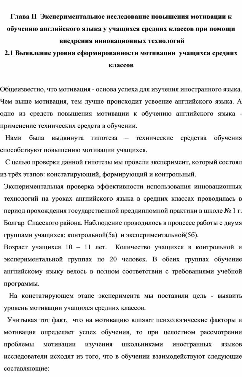 Глава II. Экспериментальное исследование повышения мотивации к обучению английского языка у учащихся средних классов при помощи