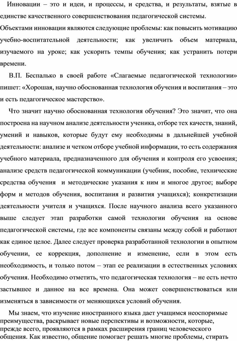 В последние годы всё чаще поднимается вопрос о применении новых инновационных технологий в средней школе. Это не только новые технические средства, но и новые формы и методы преподавания, новый подход к процессу обучения. Основной целью обучения иностранным языкам является формирование и развитие коммуникативной культуры школьников, обучение практическому овладению иностранным языком.