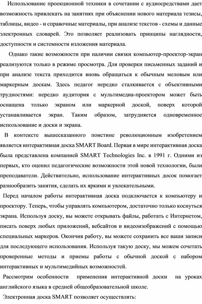 Однако такие возможности при наличии связки компьютер-проектор-экран реализуются только в режиме просмотра. Для проверки письменных заданий и при анализе текста приходится вновь обращаться к обычным меловым или маркерным доскам. Здесь педагог нередко сталкивается с объективными трудностями: нередко аудитория с мультимедиа-проектором может быть оснащена только экраном или маркерной доской, поверх которой устанавливается экран. Таким образом, затрудняется одновременное использование и доски и экрана.