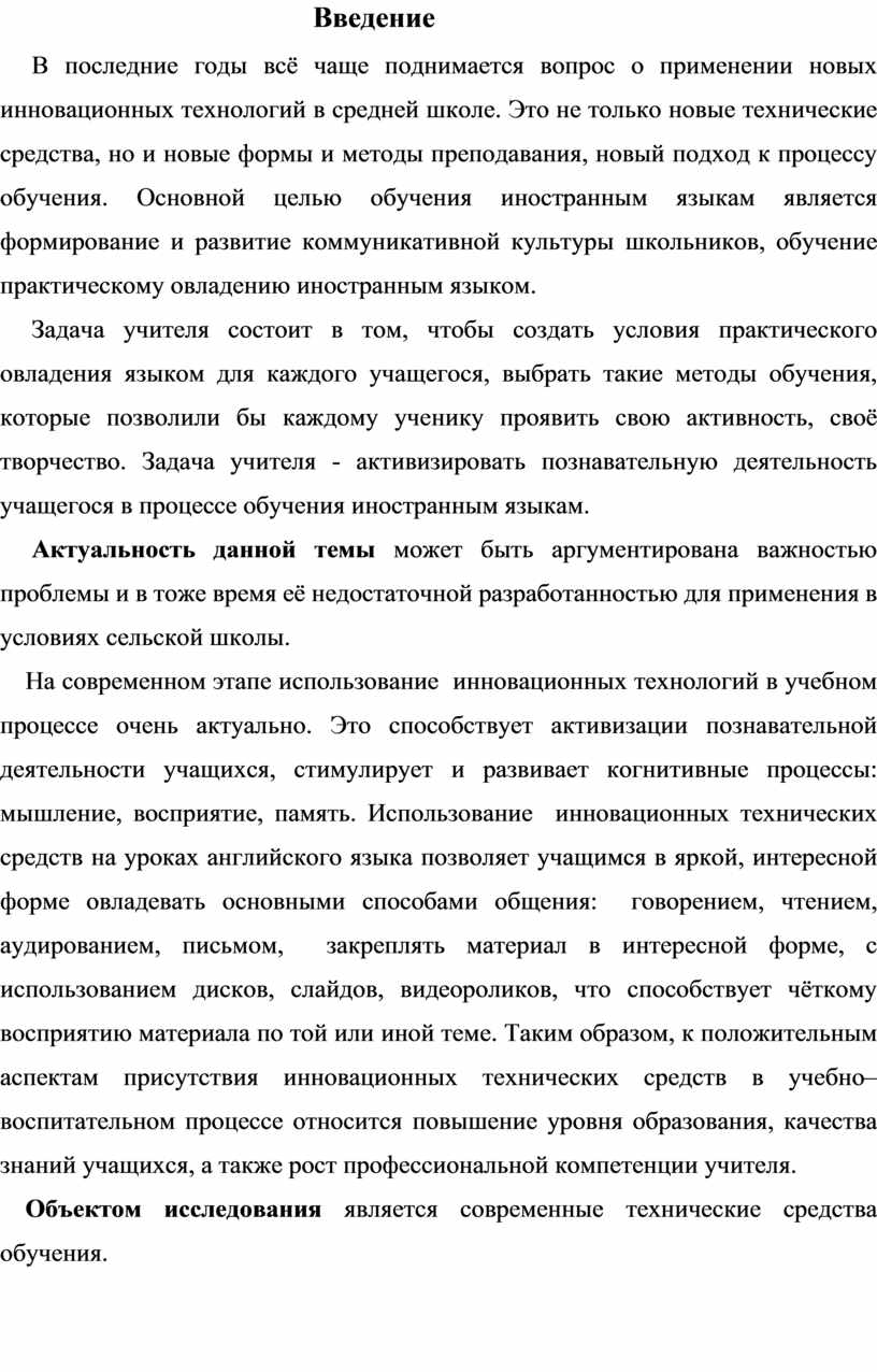 Целью исследовательской работы является теоретическое обоснование и разработка педагогических условий, обеспечивающих использование новых инновационных технологий в школе через усиление мотивов изучения предмета «Английский язык».