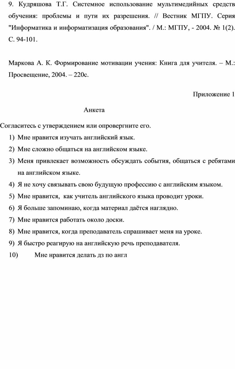 12. Маркова А. К. Формирование мотивации учения: Книга для учителя. – М.: Просвещение, 2004. – 220с.