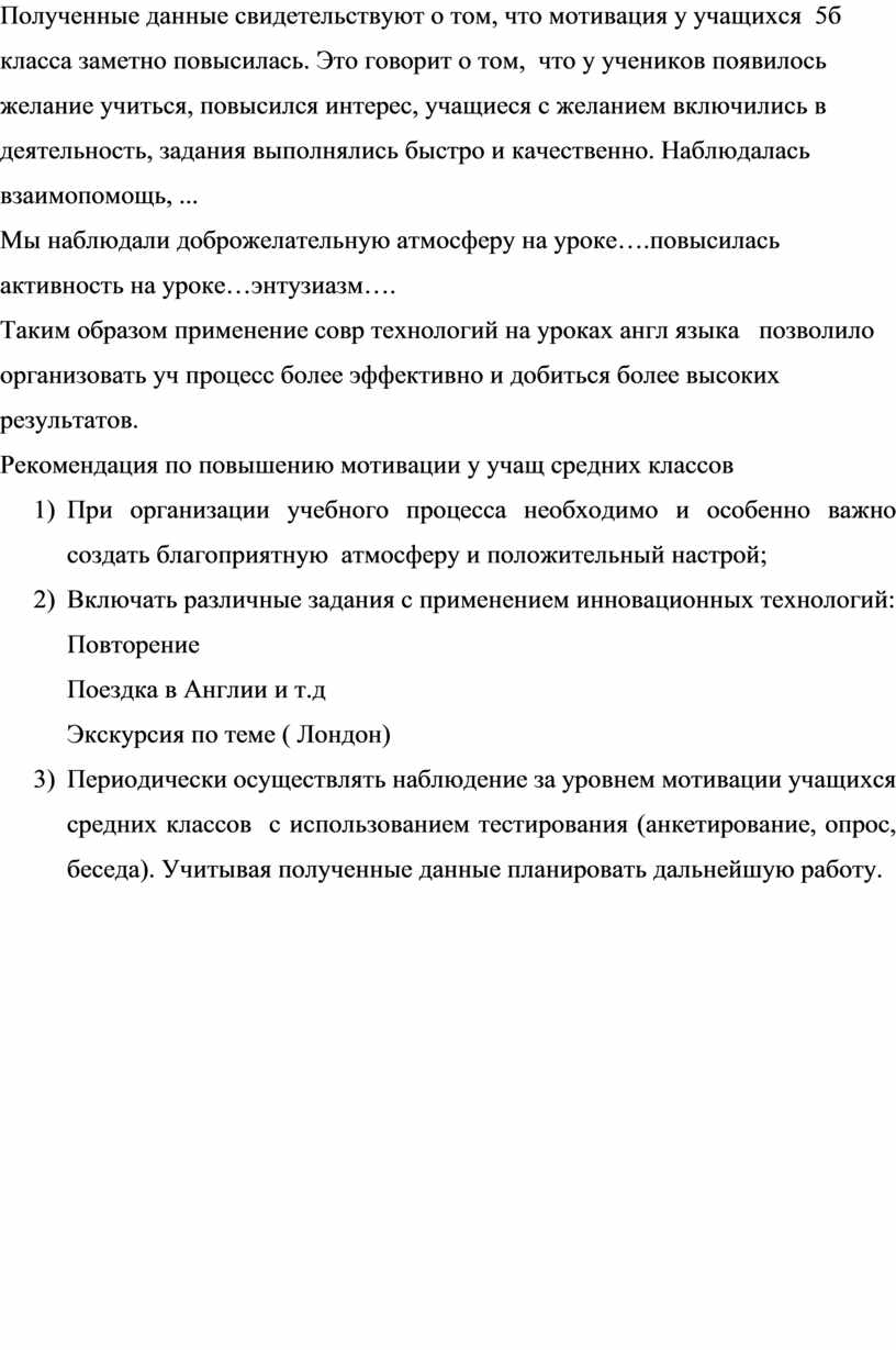 Последний этап заключался в анализе проделанной нами работы и полученных в результате этого экспериментальных данных, формулировании рекомендаций по повышению мотивации при использовании инновационных технологий.