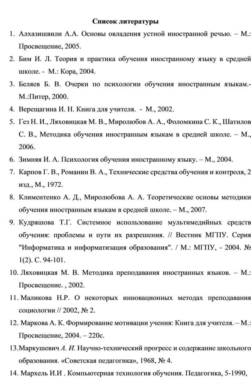 5. Гез Н. И., Ляховицкая М. В., Миролюбов А. А., Фоломкина С. К., Шатилов С. В., Методика обучения иностранным языкам в средней школе. – М., 2006.