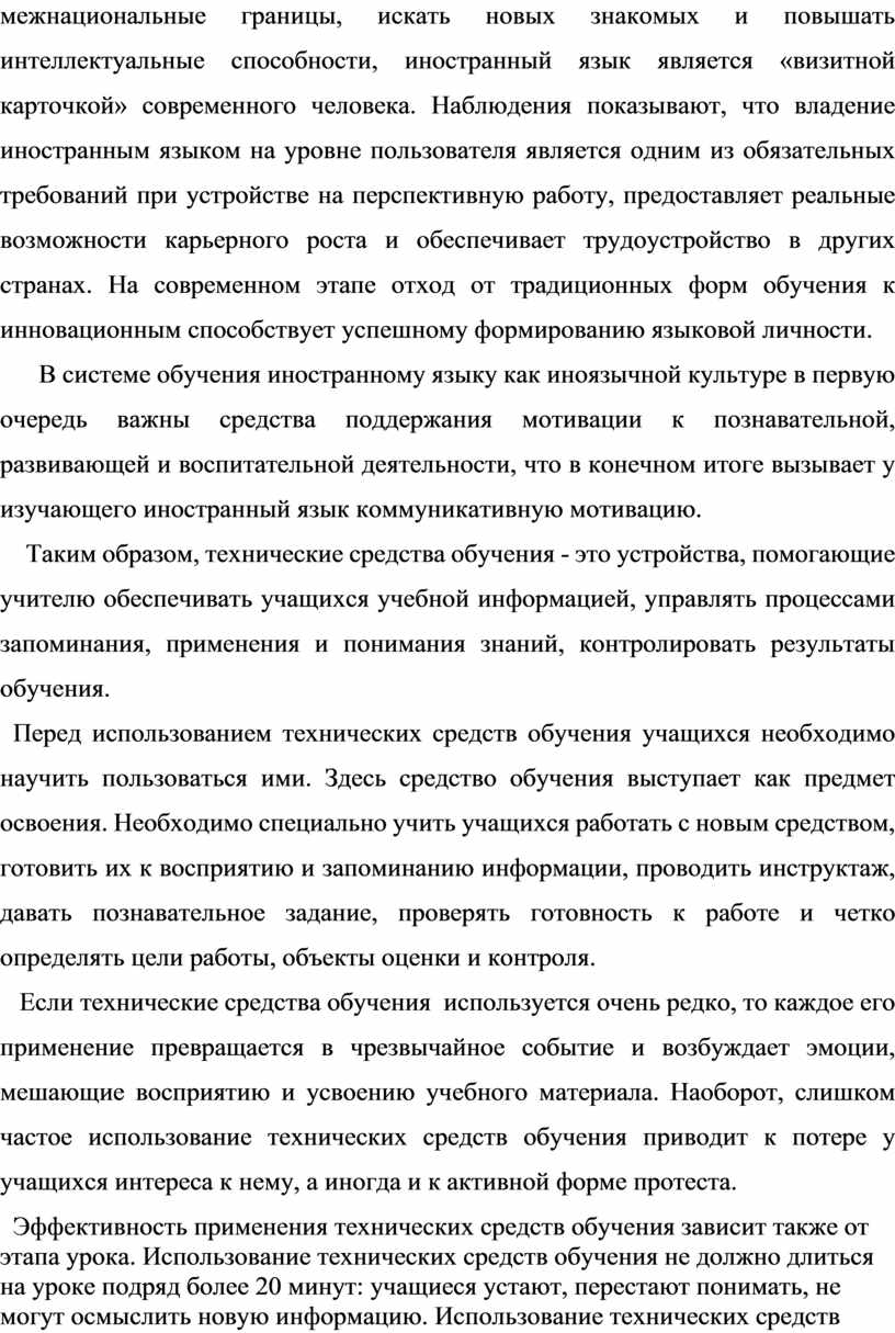 Активное применение технических средств обучения - это не привилегия отдельных учителей. Технические средства обучения становятся неотъемлемой частью учебного процесса везде, где есть увлеченные своим делом учителя, где обучение стало творчеством. Там где технические средства используются грамотно и систематически, они способствуют повышению эффективности и качества обучения.