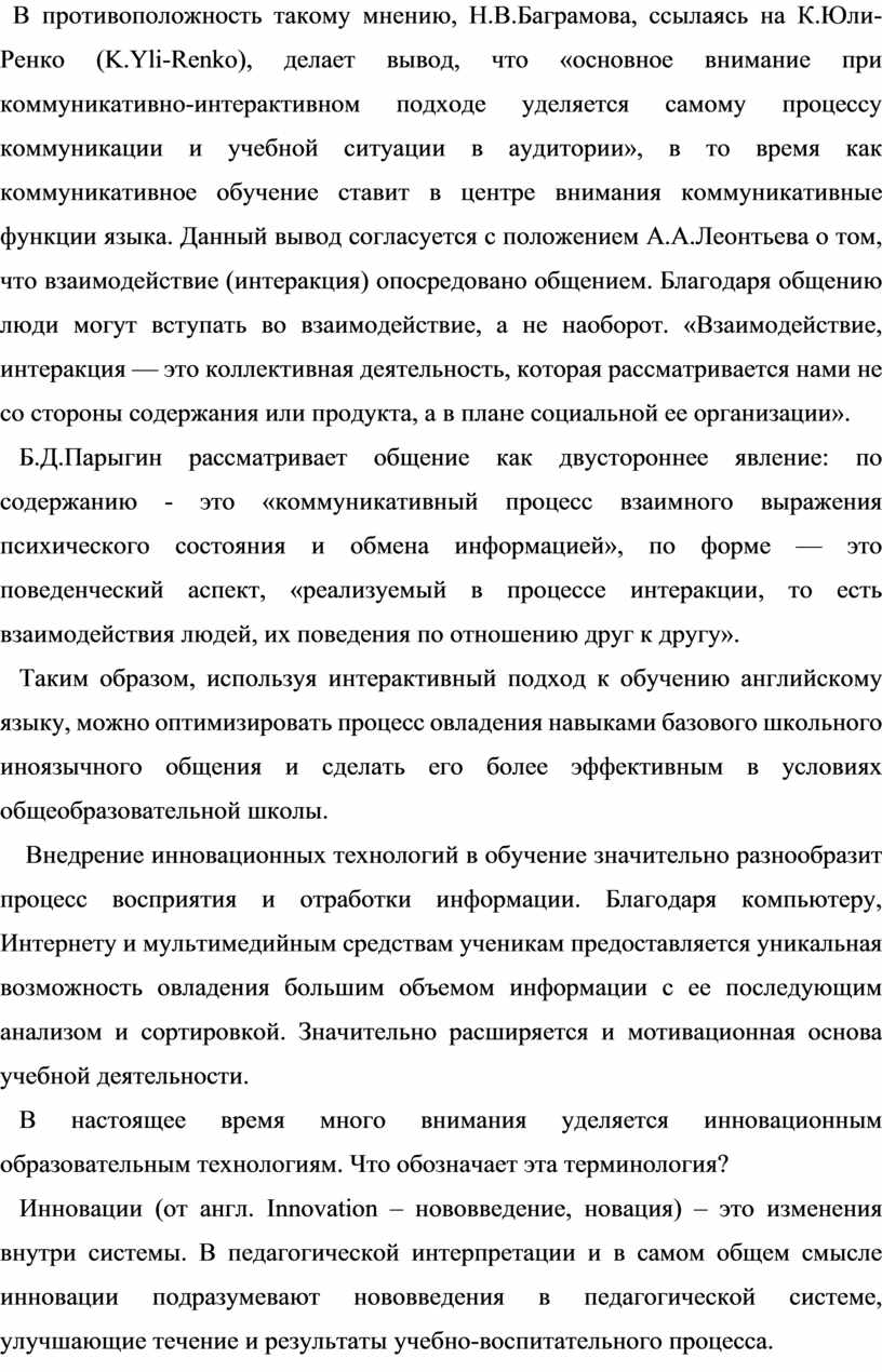 В противоположность такому мнению, Н.В.Баграмова, ссылаясь на К.Юли-Ренко (K.Yli-Renko), делает вывод, что «основное внимание при коммуникативно-интерактивном подходе уделяется самому процессу коммуникации и учебной ситуации в аудитории», в то время как коммуникативное обучение ставит в центре внимания коммуникативные функции языка. Данный вывод согласуется с положением А.А.Леонтьева о том, что взаимодействие (интеракция) опосредовано общением. Благодаря общению люди могут вступать во взаимодействие, а не наоборот. «Взаимодействие, интеракция — это коллективная деятельность, которая рассматривается нами не со стороны содержания или продукта, а в плане социальной ее организации».