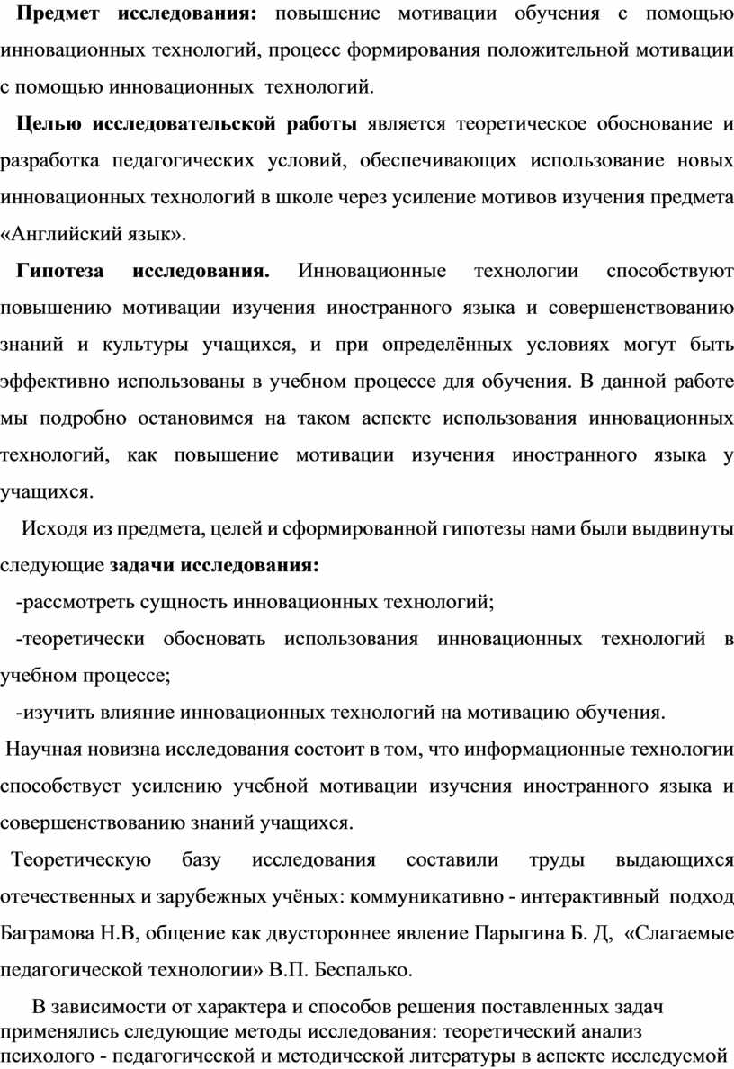 Предмет исследования: повышение мотивации обучения с помощью инновационных технологий, процесс формирования положительной мотивации с помощью инновационных технологий.