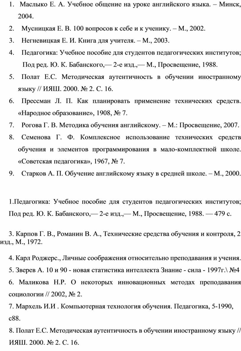 2. Бим И. Л. Теория и практика обучения иностранному языку в средней школе. - М.: Кора, 2004.