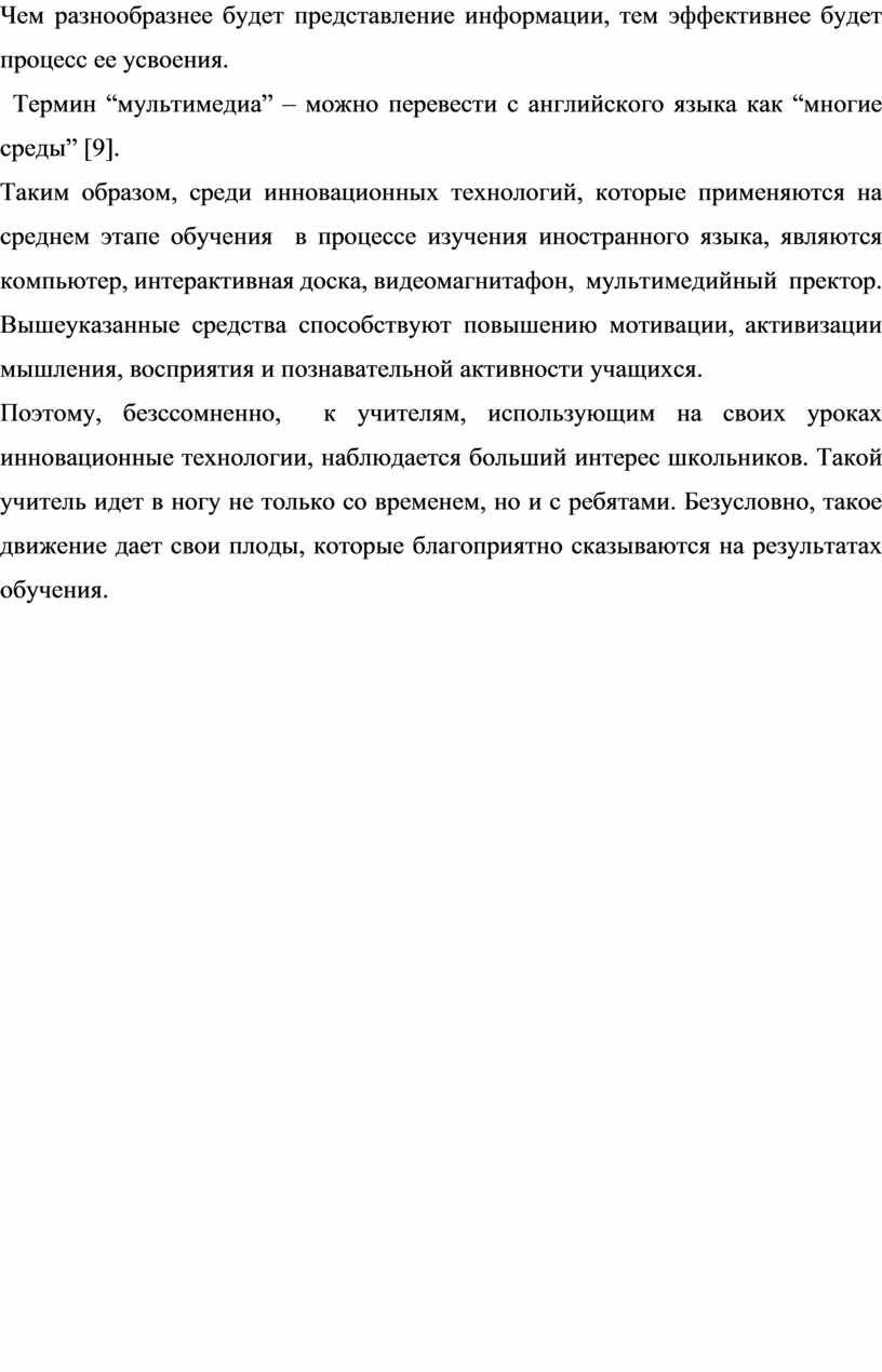 На современном этапе использование инновационных технологий в учебном процессе очень актуально. Это способствует активизации познавательной деятельности учащихся, стимулирует и развивает когнитивные процессы: мышление, восприятие, память. Использование инновационных технических средств на уроках английского языка позволяет учащимся в яркой, интересной форме овладевать основными способами общения: говорением, чтением, аудированием, письмом, закреплять материал в интересной форме, с использованием дисков, слайдов, видеороликов, что способствует чёткому восприятию материала по той или иной теме. Таким образом, к положительным аспектам присутствия инновационных технических средств в учебно–воспитательном процессе относится повышение уровня образования, качества знаний учащихся, а также рост профессиональной компетенции учителя.