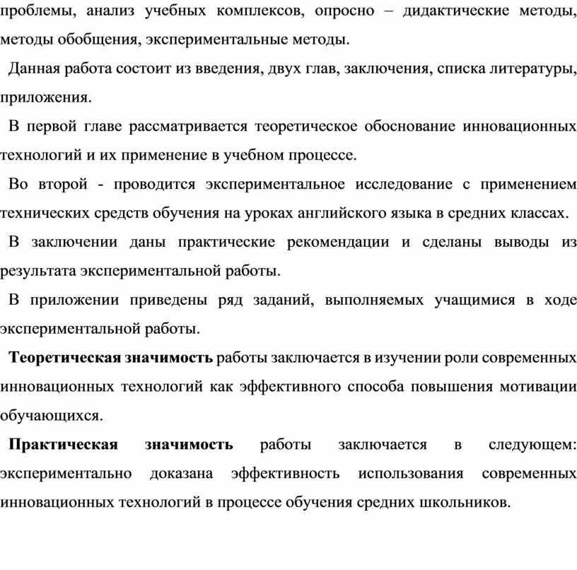 Теоретическая значимость работы заключается в изучении роли современных инновационных технологий как эффективного способа повышения мотивации обучающихся.