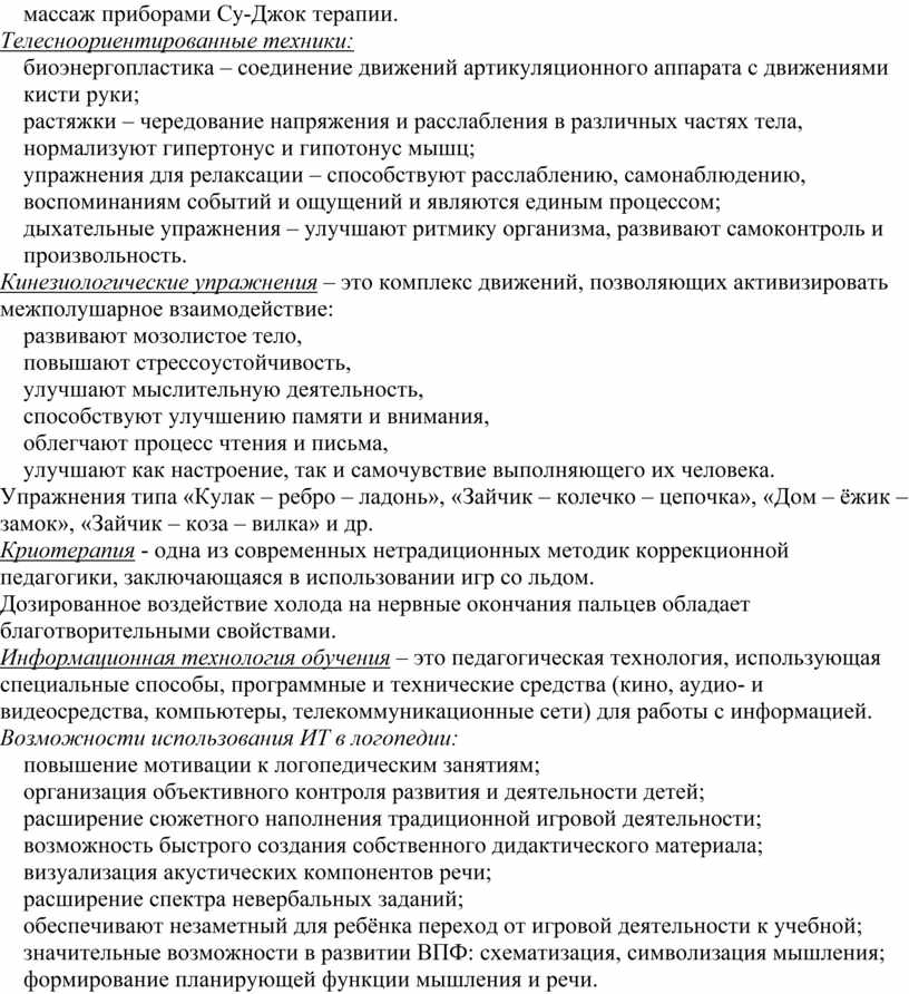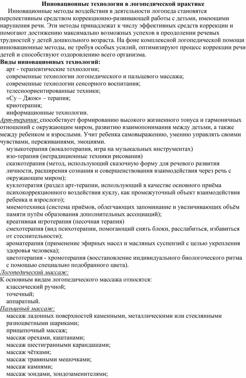 Инновационные методы воздействия в деятельности логопеда становятся перспективным средством коррекционно-развивающей работы с детьми, имеющими нарушения речи. Эти методы принадлежат к числу эффективных средств коррекции и помогают достижению максимально возможных успехов в преодолении речевых трудностей у детей дошкольного возраста. На фоне комплексной логопедической помощи инновационные методы, не требуя особых усилий, оптимизируют процесс коррекции речи детей и способствуют оздоровлению всего организма.