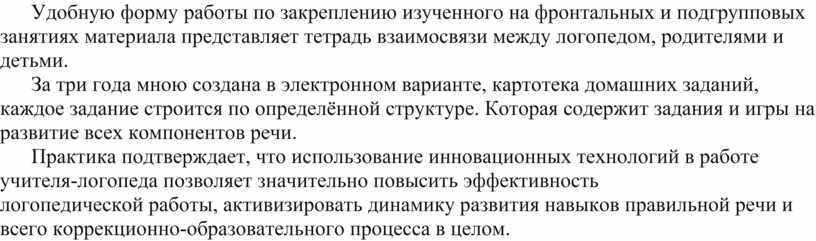 Практика подтверждает, что использование инновационных технологий в работе учителя-логопеда позволяет значительно повысить эффективность логопедической работы, активизировать динамику развития навыков правильной речи и всего коррекционно-образовательного процесса в целом.