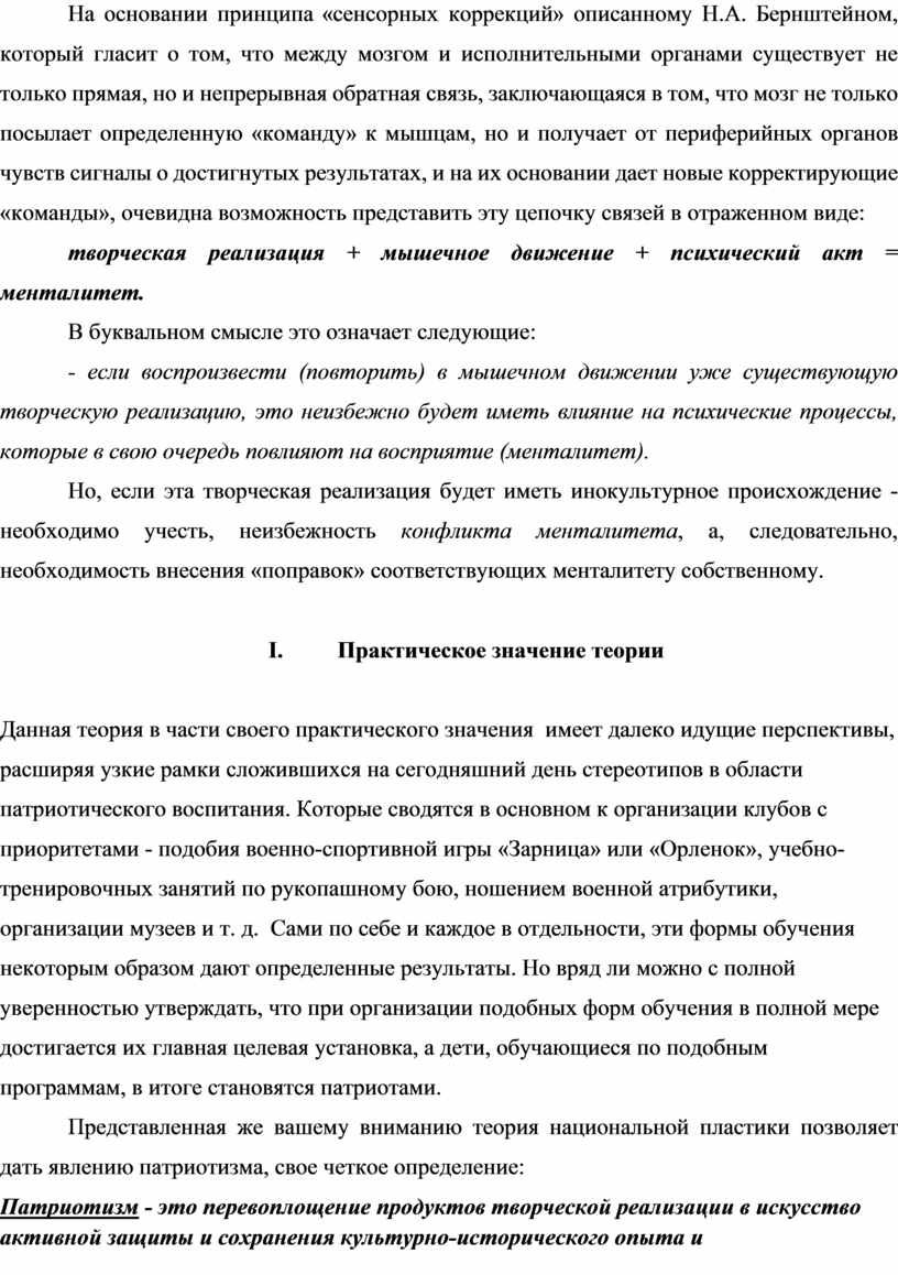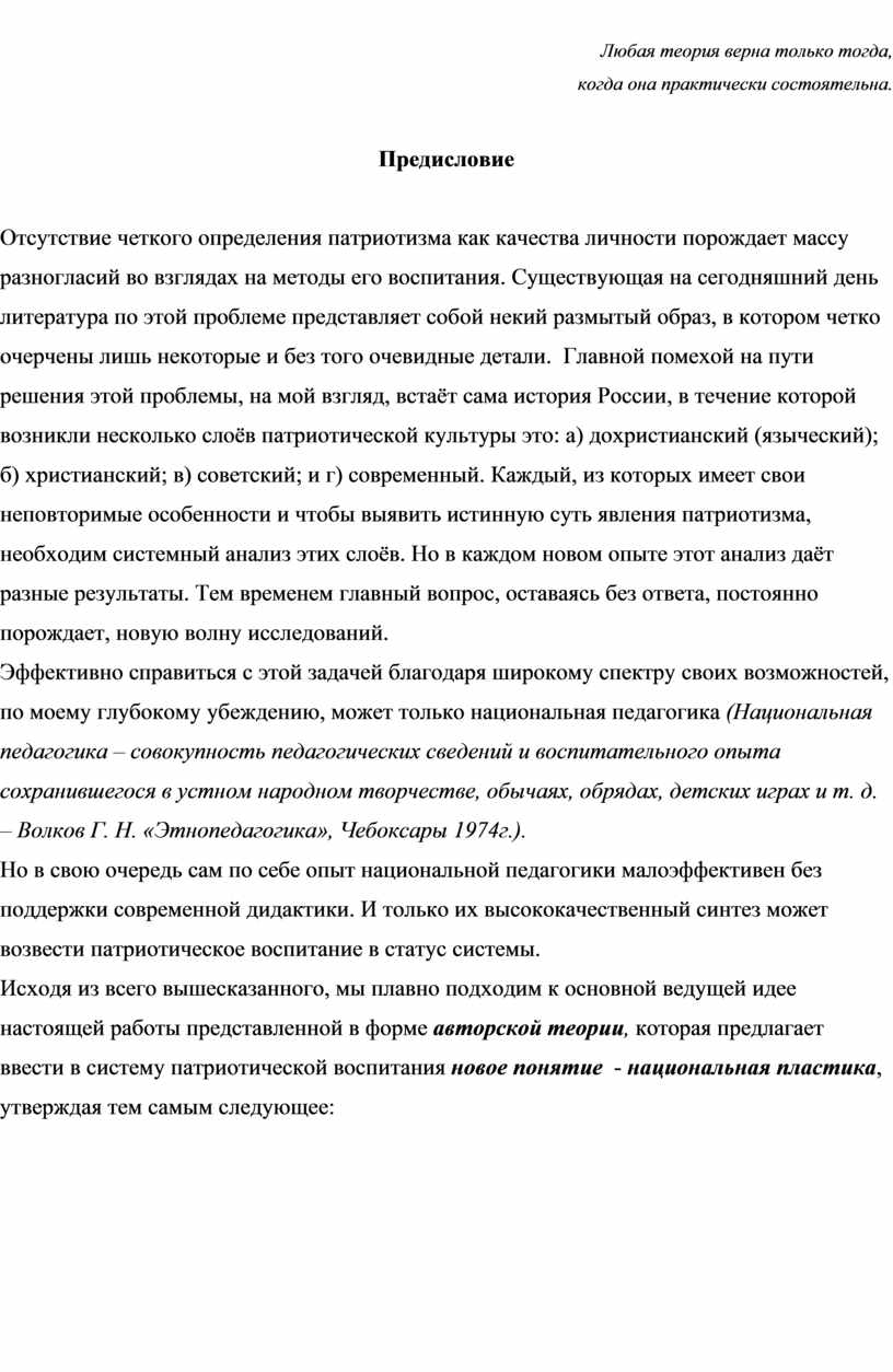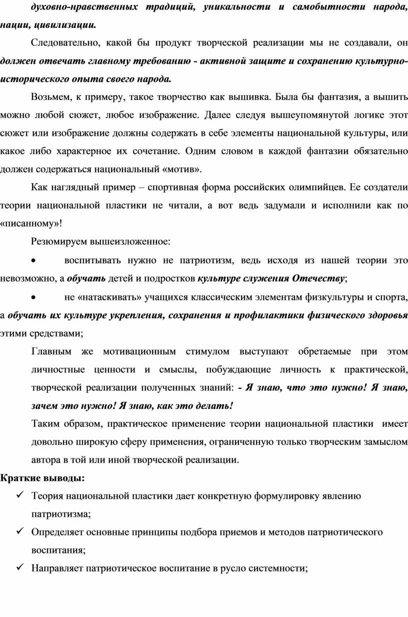 Исходя из всего вышесказанного, мы плавно подходим к основной ведущей идее настоящей работы представленной в форме авторской теории, которая предлагает ввести в систему патриотической воспитания новое понятие - национальная пластика, утверждая тем самым следующее: