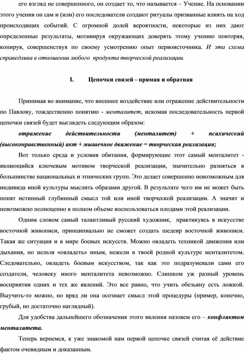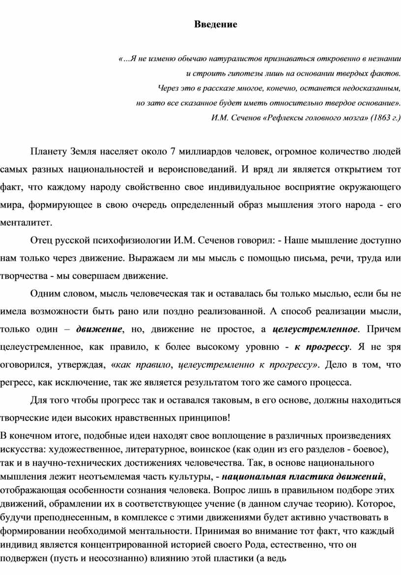 В результате своих исследований я пришел к выводу, что если все нижеизложенные в этой работе факты выстроить в логической цепочке, представив влияние очевидного взаимодействия ее звеньев, как в прямой направленности на движение, так и обратной от движения на психические процессы. Это, даст толчок новой теории, которая позволит нам делать новые неожиданные выводы, результаты которых будут иметь безусловное значение, как в практике физической культуры, патриотического воспитания, так и в педагогике в целом. К месту сказать, что на основании этой теории уже разработаны и активно апробируются автором: