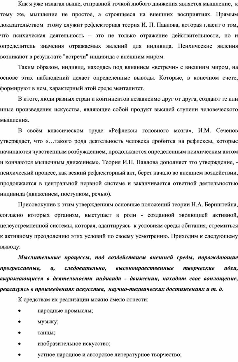 Как я уже излагал выше, отправной точкой любого движения является мышление, к тому же, мышление не простое, а строящееся на внешних восприятиях. Прямым доказательством этому служит рефлекторная теория И. П. Павлова, которая гласит о том, что психическая деятельность – это не только отражение действительности, но и определитель значения отражаемых явлений для индивида. Психические явления возникают в результате "встречи" индивида с внешним миром.