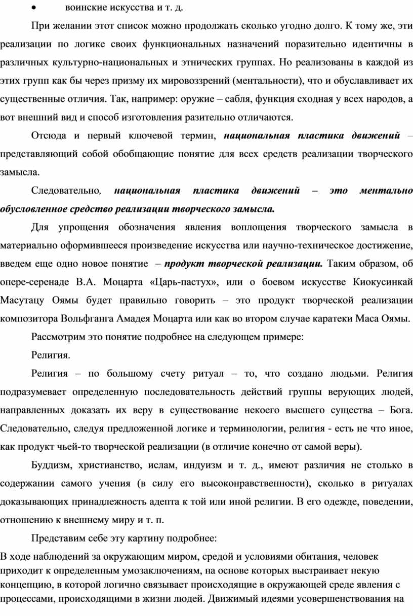 Для упрощения обозначения явления воплощения творческого замысла в материально оформившееся произведение искусства или научно-техническое достижение, введем еще одно новое понятие – продукт творческой реализации. Таким образом, об опере-серенаде В.А. Моцарта «Царь-пастух», или о боевом искусстве Киокусинкай Масутацу Оямы будет правильно говорить – это продукт творческой реализации композитора Вольфганга Амадея Моцарта или как во втором случае каратеки Маса Оямы.
