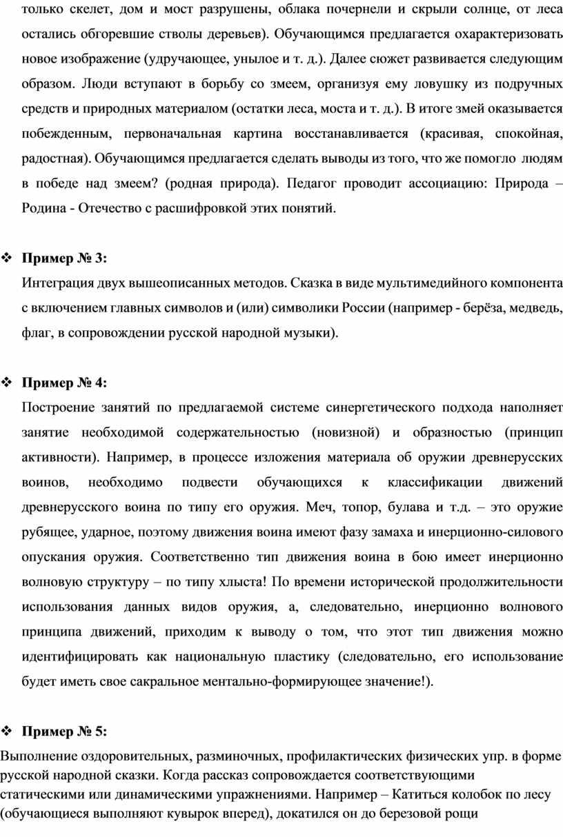 Построение занятий по предлагаемой системе синергетического подхода наполняет занятие необходимой содержательностью (новизной) и образностью (принцип активности). Например, в процессе изложения материала об оружии древнерусских воинов, необходимо подвести обучающихся к классификации движений древнерусского воина по типу его оружия. Меч, топор, булава и т.д. – это оружие рубящее, ударное, поэтому движения воина имеют фазу замаха и инерционно-силового опускания оружия. Соответственно тип движения воина в бою имеет инерционно волновую структуру – по типу хлыста! По времени исторической продолжительности использования данных видов оружия, а, следовательно, инерционно волнового принципа движений, приходим к выводу о том, что этот тип движения можно идентифицировать как национальную пластику (следовательно, его использование будет иметь свое сакральное ментально-формирующее значение!).