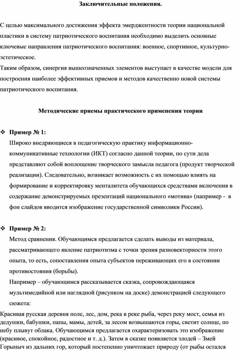 Таким образом, синергия вышеозначенных элементов выступает в качестве модели для построения наиболее эффективных приемов и методов качественно новой системы патриотического воспитания.