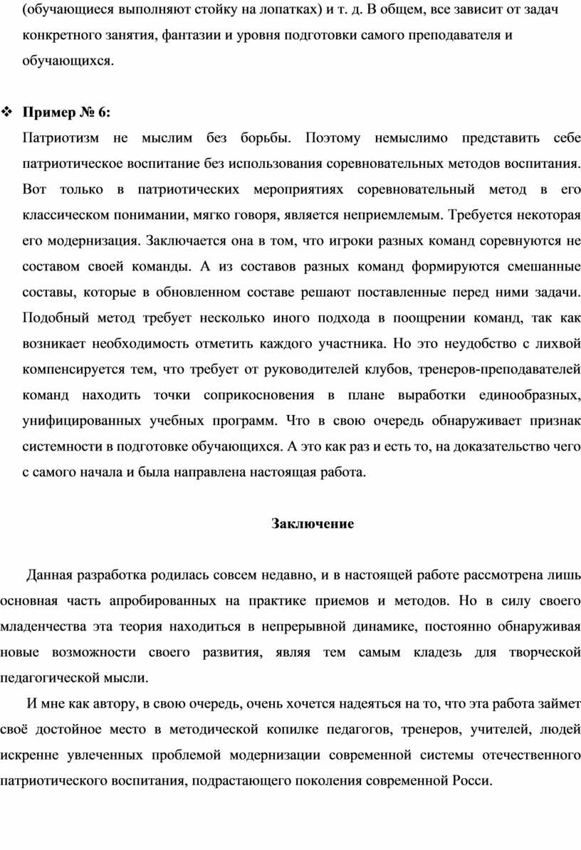 Патриотизм не мыслим без борьбы. Поэтому немыслимо представить себе патриотическое воспитание без использования соревновательных методов воспитания. Вот только в патриотических мероприятиях соревновательный метод в его классическом понимании, мягко говоря, является неприемлемым. Требуется некоторая его модернизация. Заключается она в том, что игроки разных команд соревнуются не составом своей команды. А из составов разных команд формируются смешанные составы, которые в обновленном составе решают поставленные перед ними задачи. Подобный метод требует несколько иного подхода в поощрении команд, так как возникает необходимость отметить каждого участника. Но это неудобство с лихвой компенсируется тем, что требует от руководителей клубов, тренеров-преподавателей команд находить точки соприкосновения в плане выработки единообразных, унифицированных учебных программ. Что в свою очередь обнаруживает признак системности в подготовке обучающихся. А это как раз и есть то, на доказательство чего с самого начала и была направлена настоящая работа.