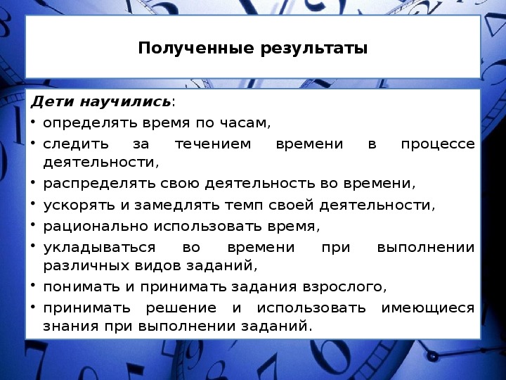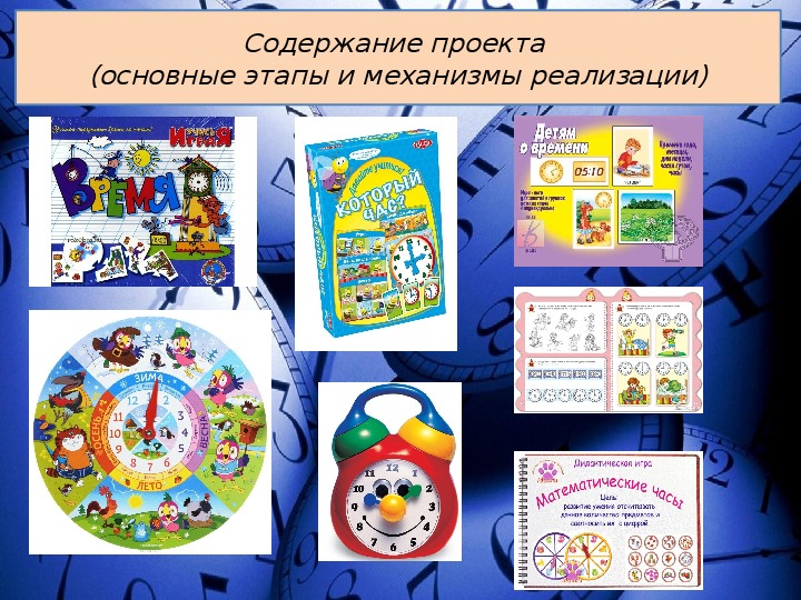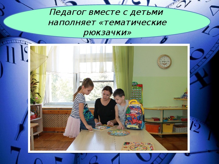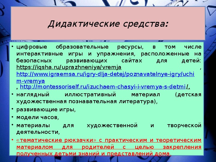 Особо, хотелось бы отметить среди дидактических средств проекта, цифровые образовательные ресурсы, в том числе интерактивные игры и упражнения, расположенные на безопасных развивающих сайтах для детей и «тематические рюкзачки» с практическим и теоретическим материалом для родителей с целью за-крепления полученных детьми знаний и представлений дома и теоретическим материалом для родителей.Презентация проекта "Путешествие со временем"