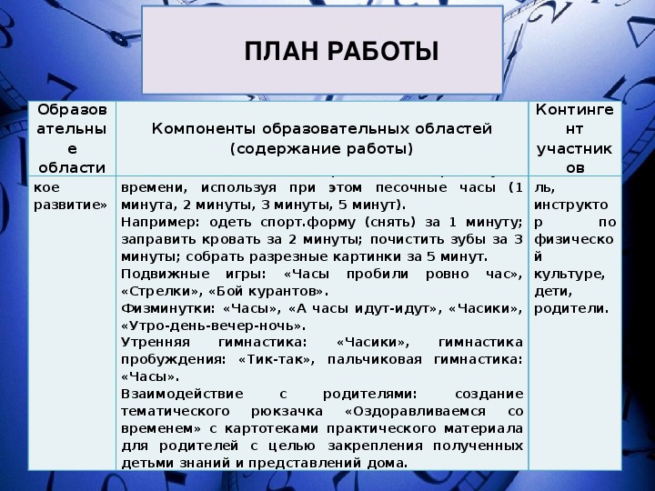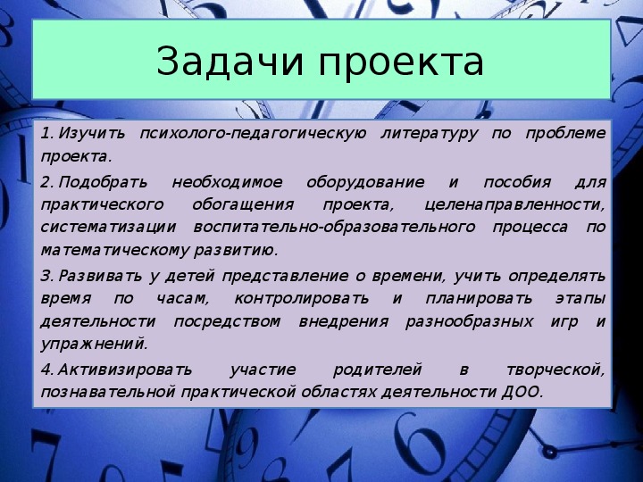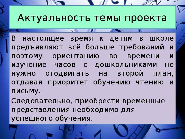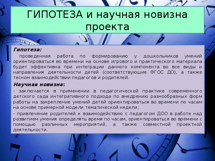 В основе проекта лежит идея организовать систему работы по формированию временных представлений в различных сферах деятельности детей дошкольного возраста: в образовательной, совместной и самостоятельной деятельности воспитателя с детьми и родителями.