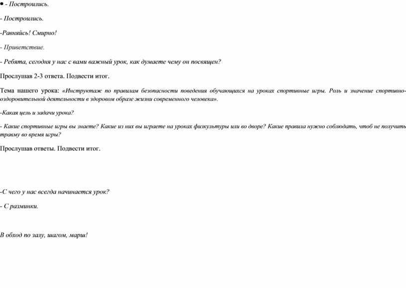 - Построились. -Равняйсь! Смирно! - Приветствие. - Ребята, сегодня у нас с вами важный урок, как думаете чему он посвящен? Прослушав 2-3 ответа. Подвести итог. Тема нашего урока: «Инструктаж по правилам безопасности поведения обучающихся на уроках спортивные игры. Роль и значение спортивно-оздоровительной деятельности в здоровом образе жизни современного человека». -Какая цель и задачи урока? - Какие спортивные игры вы знаете? Какие из них вы играете на уроках физкультуры или во дворе? Какие правила нужно соблюдать, чтоб не получить травму во время игры? Прослушав ответы. Подвести итог.