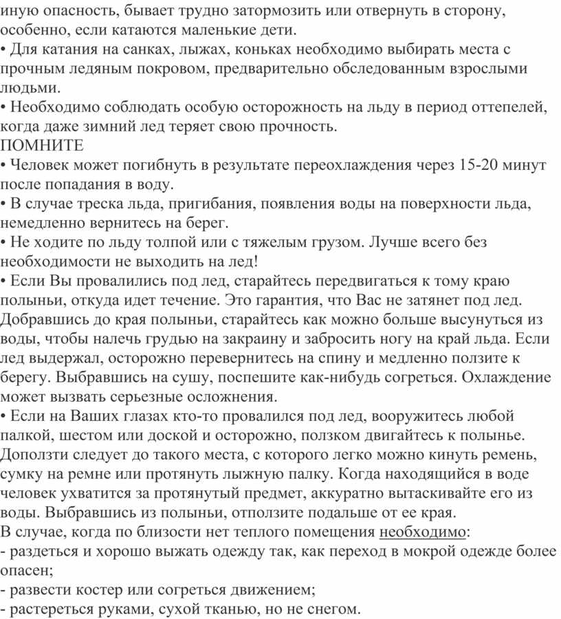 • Для катания на санках, лыжах, коньках необходимо выбирать места с прочным ледяным покровом, предварительно обследованным взрослыми людьми.