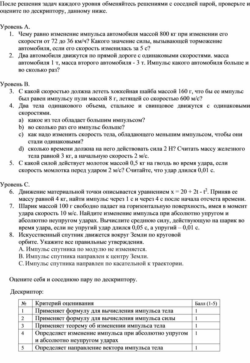 После решения задач каждого уровня обменяйтесь решениями с соседней парой, проверьте и оцените по дескриптору, данному ниже.