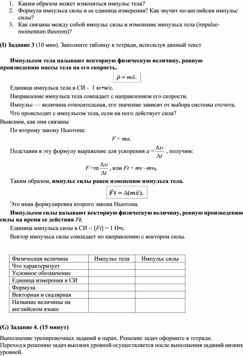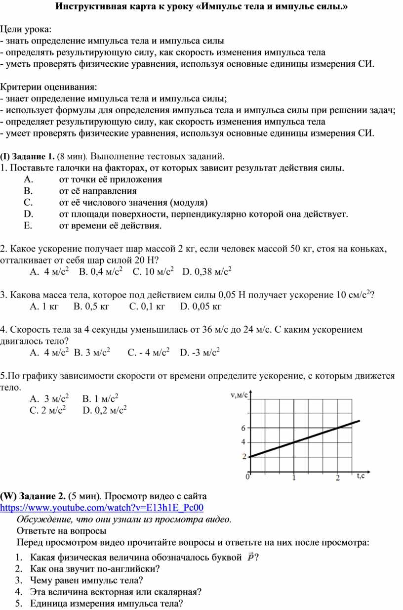 Инструктивная карта к уроку «Импульс тела и импульс силы.»