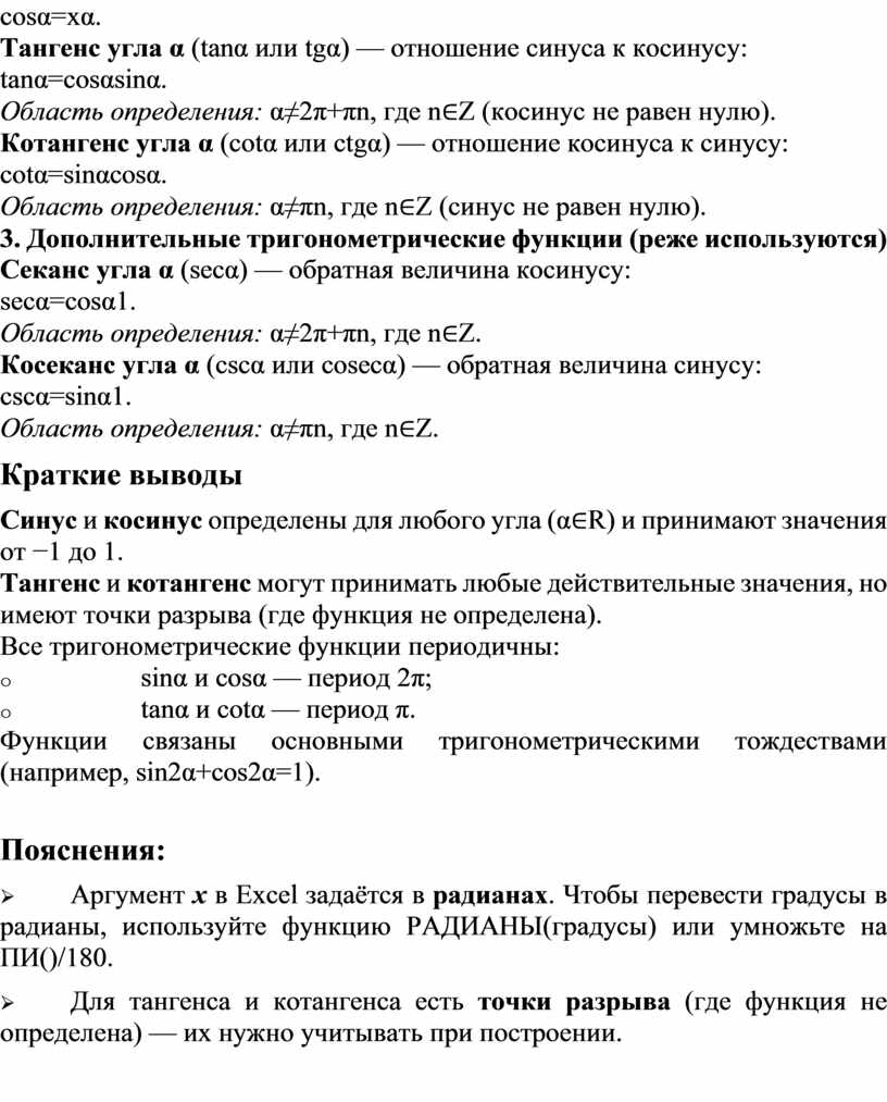 Ø Аргумент x в Excel задаётся в радианах. Чтобы перевести градусы в радианы, используйте функцию РАДИАНЫ(градусы) или умножьте на ПИ()/180.