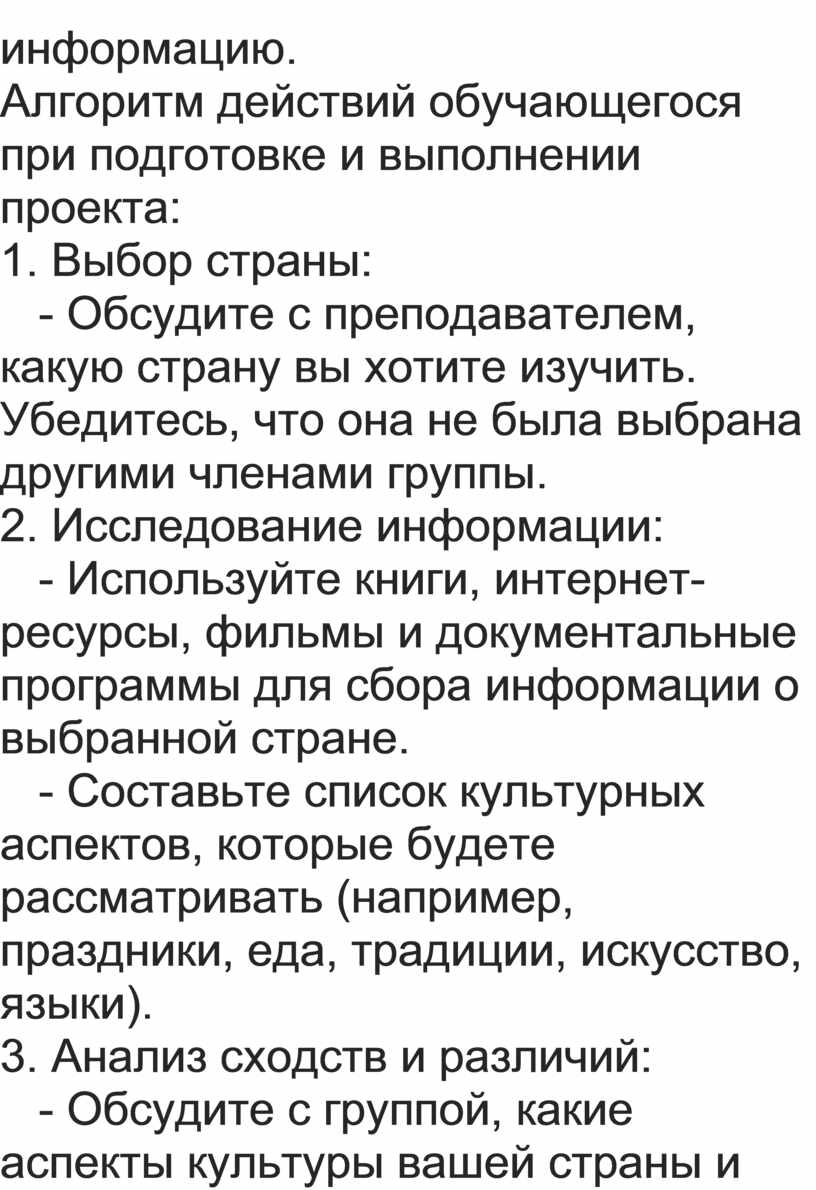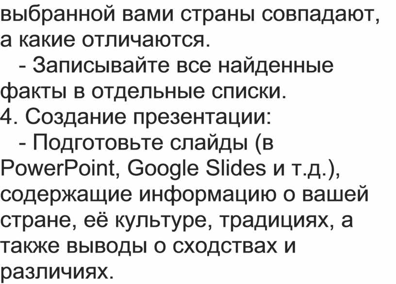 - Подготовьте слайды (в PowerPoint, Google Slides и т.д.), содержащие информацию о вашей стране, её культуре, традициях, а также выводы о сходствах и различиях.