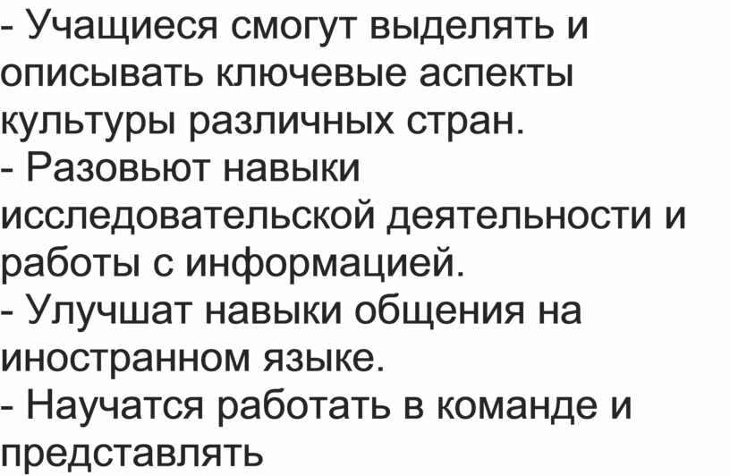 - Учащиеся смогут выделять и описывать ключевые аспекты культуры различных стран.