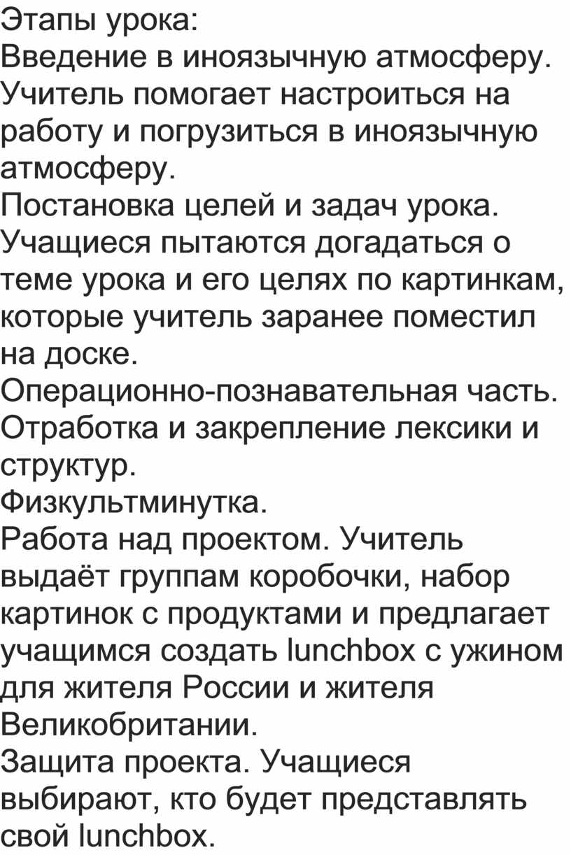 Работа над проектом. Учитель выдаёт группам коробочки, набор картинок с продуктами и предлагает учащимся создать lunchbox с ужином для жителя России и жителя Великобритании.