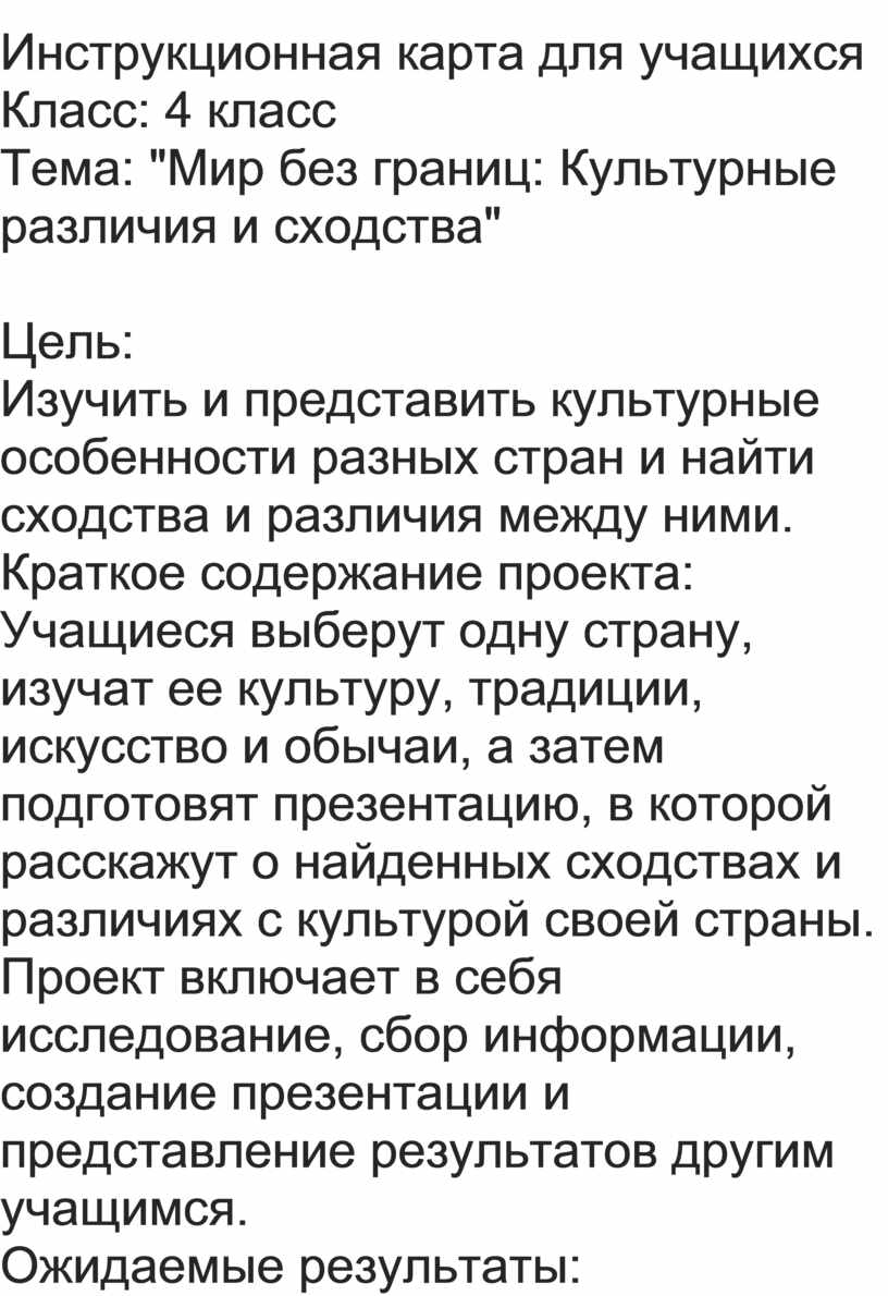 Учащиеся выберут одну страну, изучат ее культуру, традиции, искусство и обычаи, а затем подготовят презентацию, в которой расскажут о найденных сходствах и различиях с культурой своей страны. Проект включает в себя исследование, сбор информации, создание презентации и представление результатов другим учащимся.