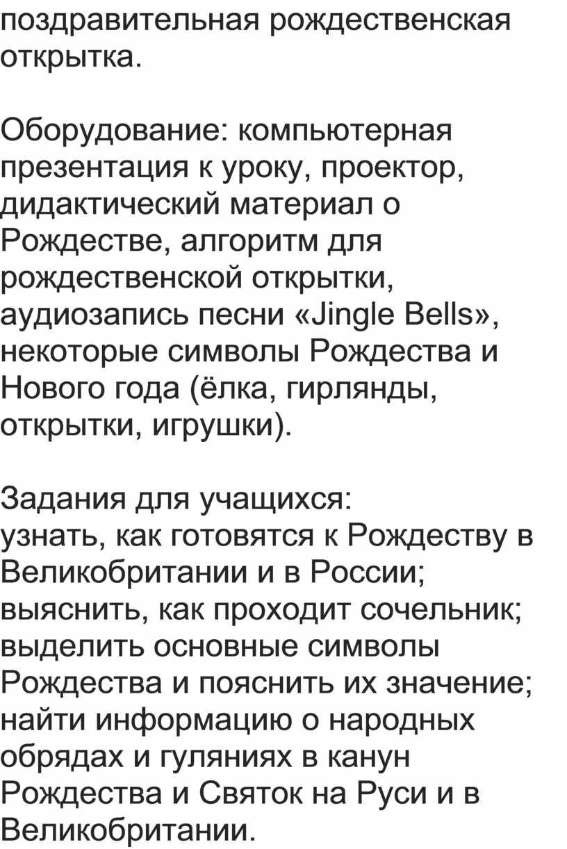 Оборудование: компьютерная презентация к уроку, проектор, дидактический материал о Рождестве, алгоритм для рождественской открытки, аудиозапись песни «Jingle Bells», некоторые символы Рождества и Нового года (ёлка, гирлянды, открытки, игрушки).