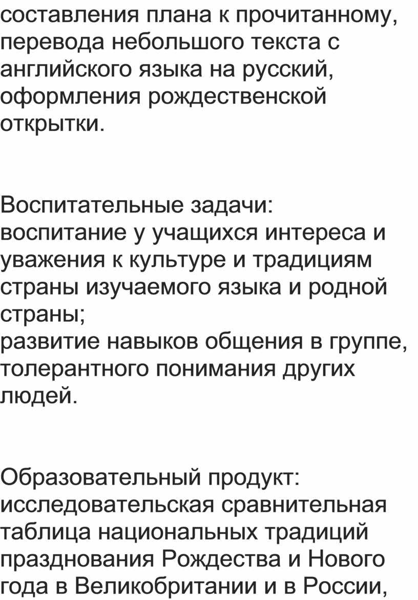 Образовательный продукт: исследовательская сравнительная таблица национальных традиций празднования Рождества и Нового года в Великобритании и в России, поздравительная рождественская открытка.