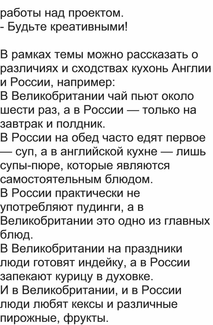 В рамках темы можно рассказать о различиях и сходствах кухонь Англии и России, например: