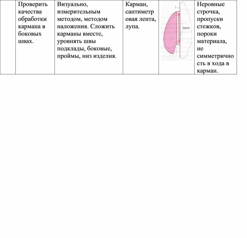 Проверить качества обработки кармана в боковых швах. |