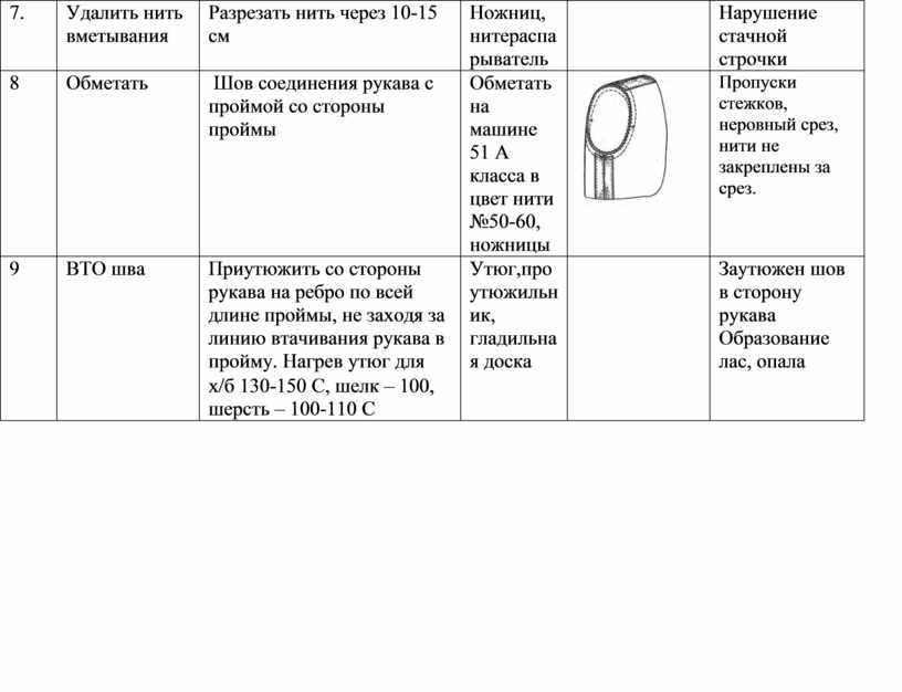 Приутюжить со стороны рукава на ребро по всей длине проймы, не заходя за линию втачивания рукава в пройму. Нагрев утюг для х/б 130-150 С, шелк – 100, шерсть – 100-110 С |