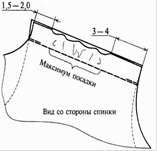 1.Полочку и спинку сложить лицевыми сторонами внутрь, уравнивая срезы, сколоть срезы по спинке, делая посадку по спинке (на выпуклость лопаток), отступив от горловины 1,5 – 2,0 см, и заканчивают не доходя до срезов проймы на 3-4 см. 2.Стачать плечевые срезы по полочке швом шириной 0,7- 1 см. При индивидуальном изготовлении эта величина может быть больше. 3. Обметать на спец машине срез плечевого шва. 4.По плечевому шву проложить отделочную строчку на 0,1 см со стороны полочки. 5.Приутюжить в готовом виде |