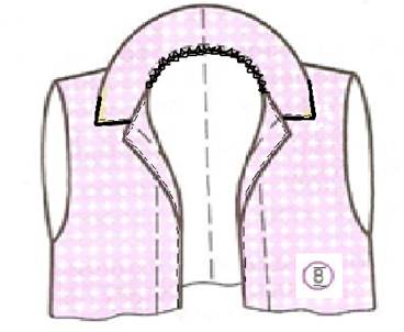 1.Готовый воротник вложить между подбортом и горловиной изделия; 2.Втачать воротник от левого уступа до вершины левого подборта одной строчкой соединяя горловину полочки, оба воротника и подборт; Шириной шва 0.7-1 см 3.Обметать припуск шва втачивания воротника в горловину . |