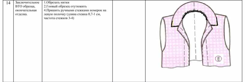 1.Обрезать нитки 2.Гоовый образец отутюжить 4.Пришить ручными стежками номерок на левую полочку (длина стежка 0,7-1 см, частота стежков 3-4) |