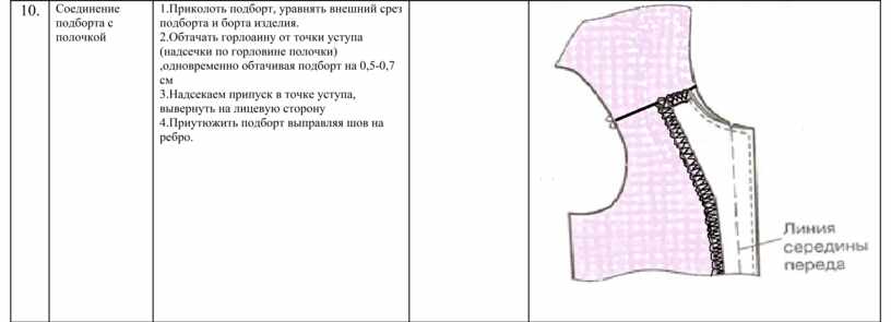 1.Приколоть подборт, уравнять внешний срез подборта и борта изделия. 2.Обтачать горлоаину от точки уступа (надсечки по горловине полочки) ,одновременно обтачивая подборт на 0,5-0,7 см 3.Надсекаем припуск в точке уступа, вывернуть на лицевую сторону 4.Приутюжить подборт выправляя шов на ребро. |