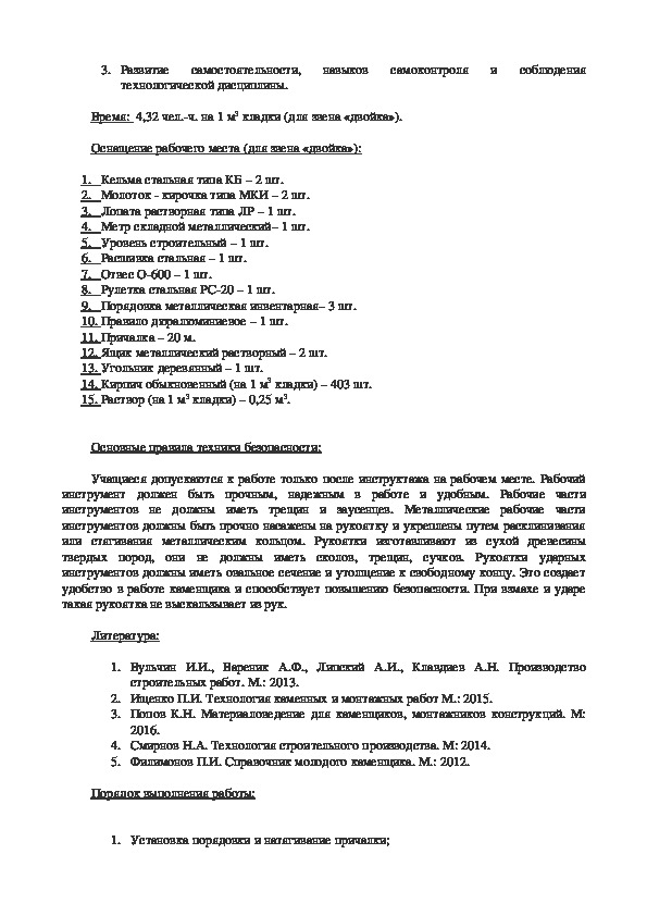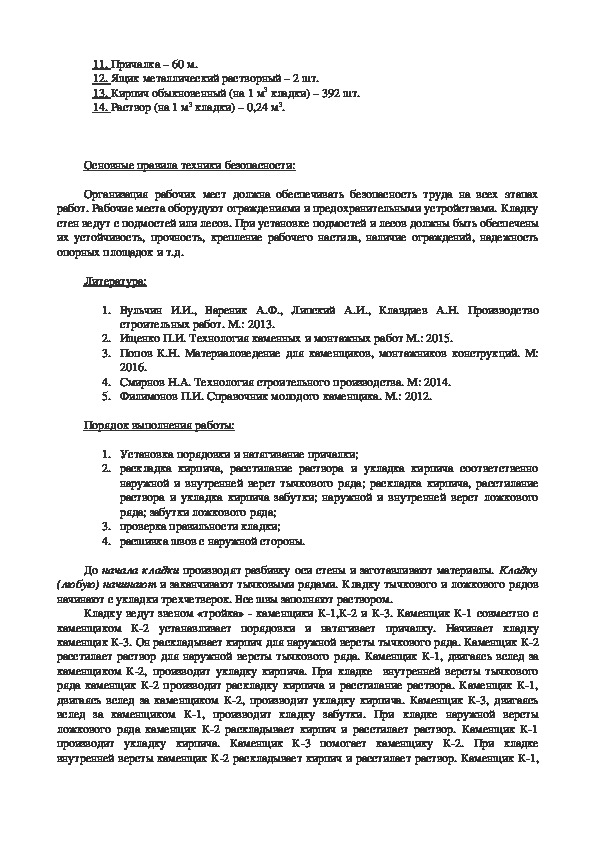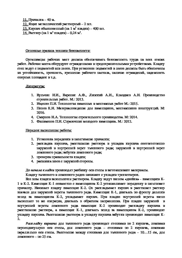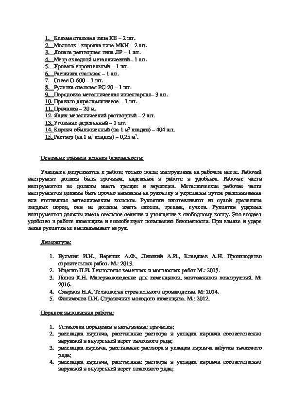 14. Раствор (на 1 м3 кладки) – 0,236 м3.Основные правила техники безопасности: