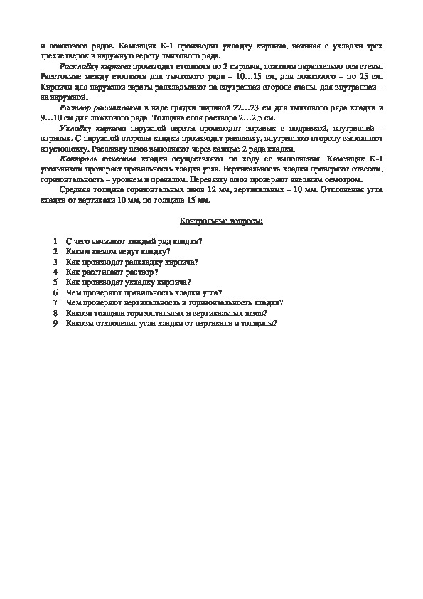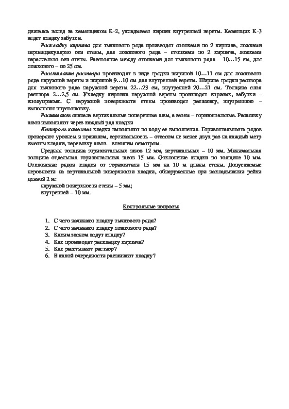 Контроль качества кладки осуществляют по ходу ее выполнения. Каменщик К1