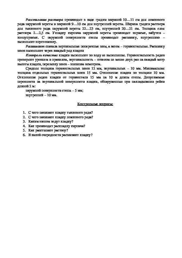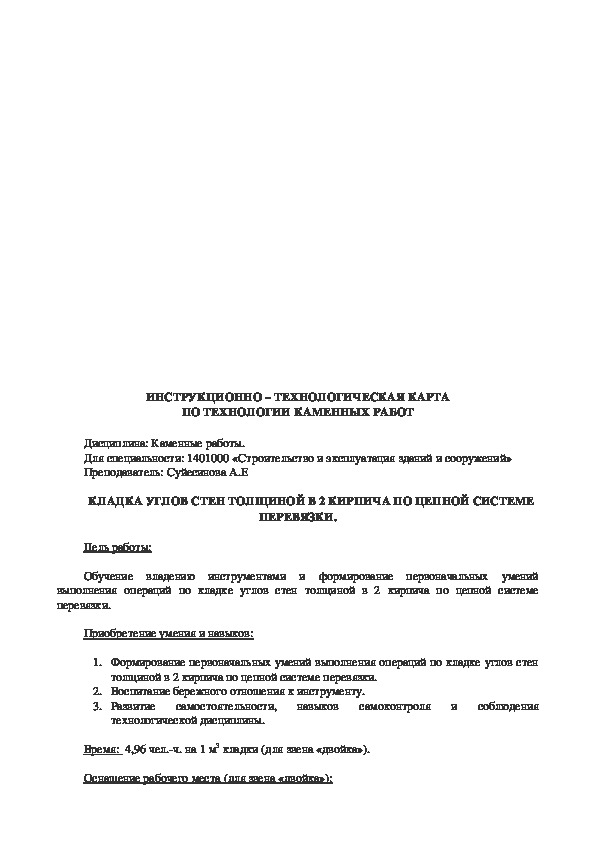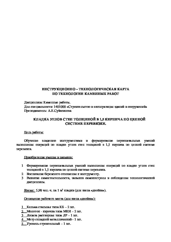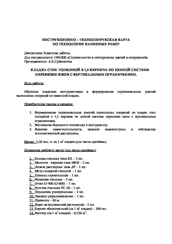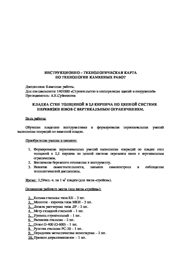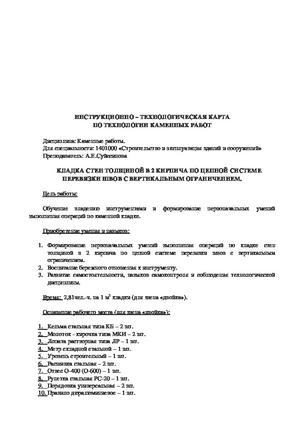 6. Какова толщина швов (вертикальных и горизонтальных) при кирпичной кладке?ИНСТРУКЦИОННО – ТЕХНОЛОГИЧЕСКАЯ КАРТА