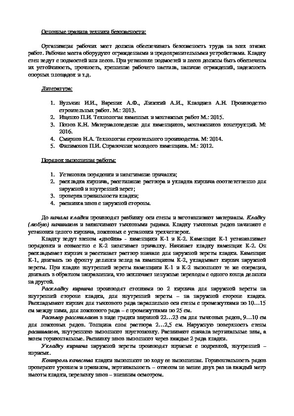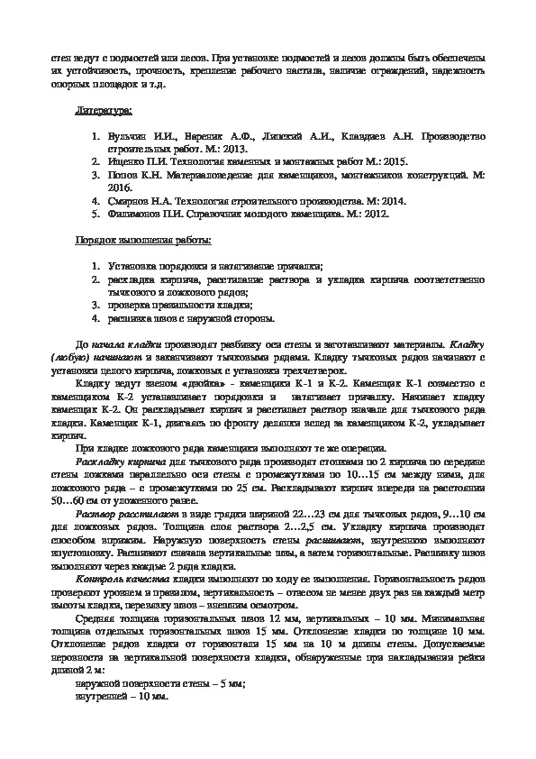 2. Ищенко П.И. Технология каменных и монтажных работ М.: 2015.